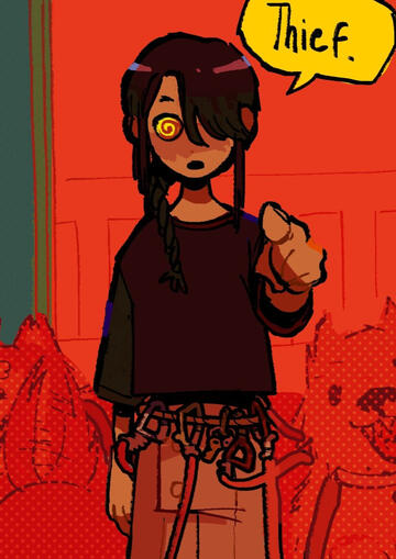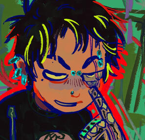 I really like bright and warm colors that you can see constantly in my art! The grotesque, the cute and just weird things are elements I try to use from time to time on my pieces, though it is changing constantly!Most of my interest are anime and manga related, though sometimes I talk about games and music too.My favorite manga is Chainsaw Man!